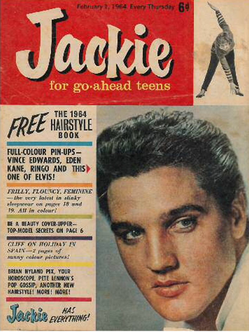 Jackie was first published on the 11th January 1964 and concluded on the 3rd July 1993 (1539 issues). It was published by DC Thomson, based in Dundee, Scotland. It has been suggested that the comic’s title was named after Jackie Kennedy, wife of American President John F. Kennedy who had been assassinated two month before the comic was first issued. This was a pioneer comic that put the photograph story strip into printed form that many others would follow. Elvis appeared on the front cover of this comic twice. There is a very rare set of pop star cards that came free with the comic, only one of the cards pictured Elvis.