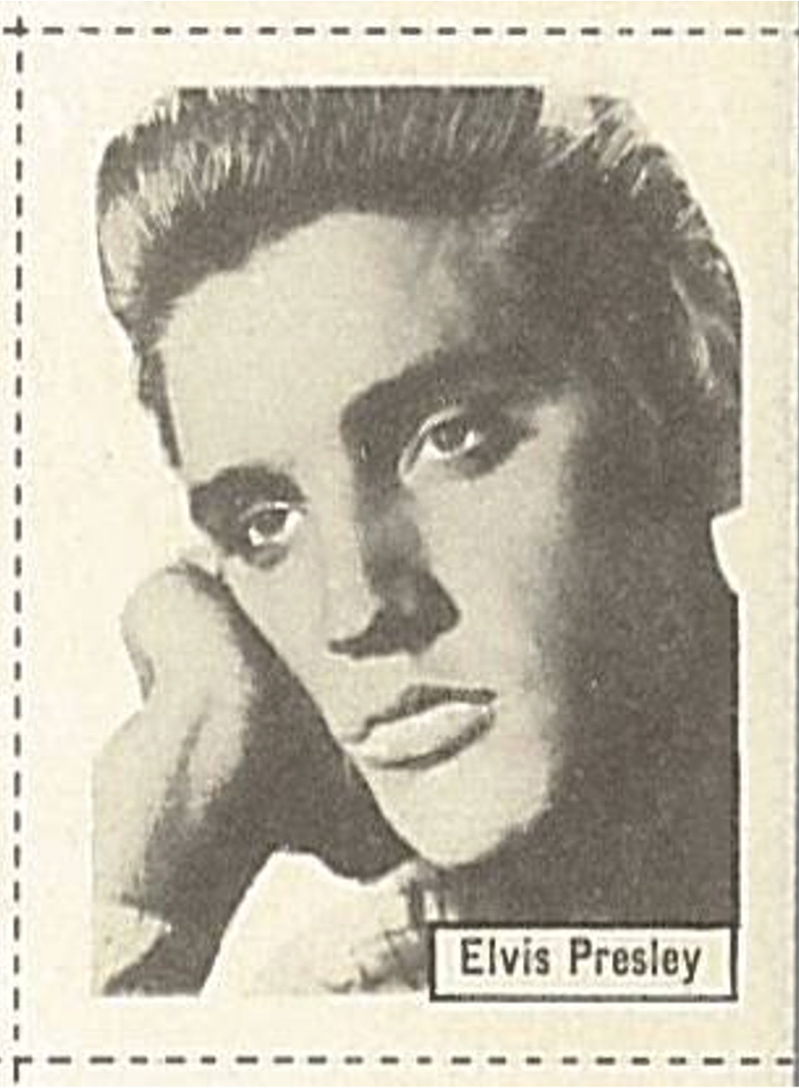 Glamour Trading cards - 24th March 1957. Printed by Brent Press Ltd. London for C. Arthur Pearson Ltd. London. The following week another card was issued; also with 20 images. Right: an advert from the previous week. Center right: The Elvis card. Far right: complete card sheet.