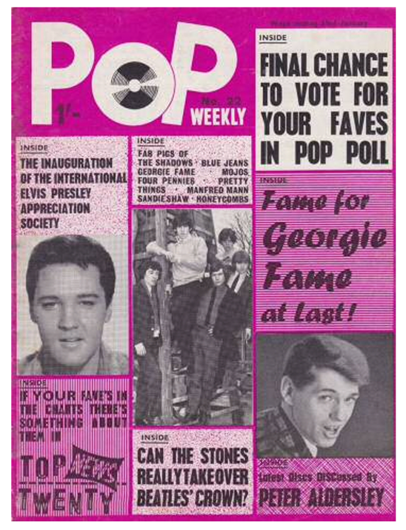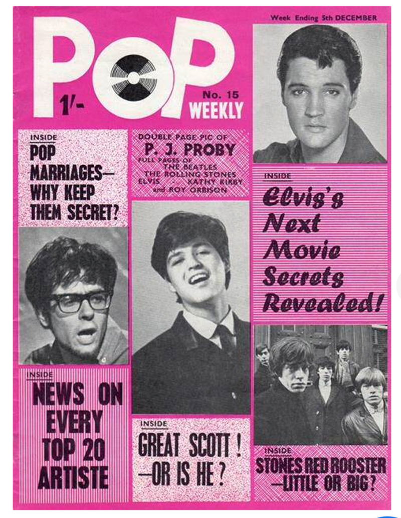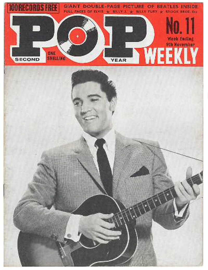 Pop Weekly was one of Albert Hand’s (of Elvis Monthly fame) most successful publications of the mid 1960s. It was preceded by Pop Ten Monthly (page ). The first issue came out on 1st September 1962 and ceased with the 12th February 1966 issue. This small and very collectable magazine brought readers the latest, up-to-the-minute news on all things POP. Artists and groups of the day together with great (and on many occasions exclusive) photographs of the stars. Elvis was well represented both within its pages and on the front cover. For the first few years the cover usually carried a single artist but the latter issues carried multiple artists on the covers. Following its demise it was incorporated into Pop Shop and Teen Beat, yet another of Albert Hand’s many music publications. Though Elvis’ name appeared on Pop Shop and Teen Beat no copies have been found with his image on the cover/