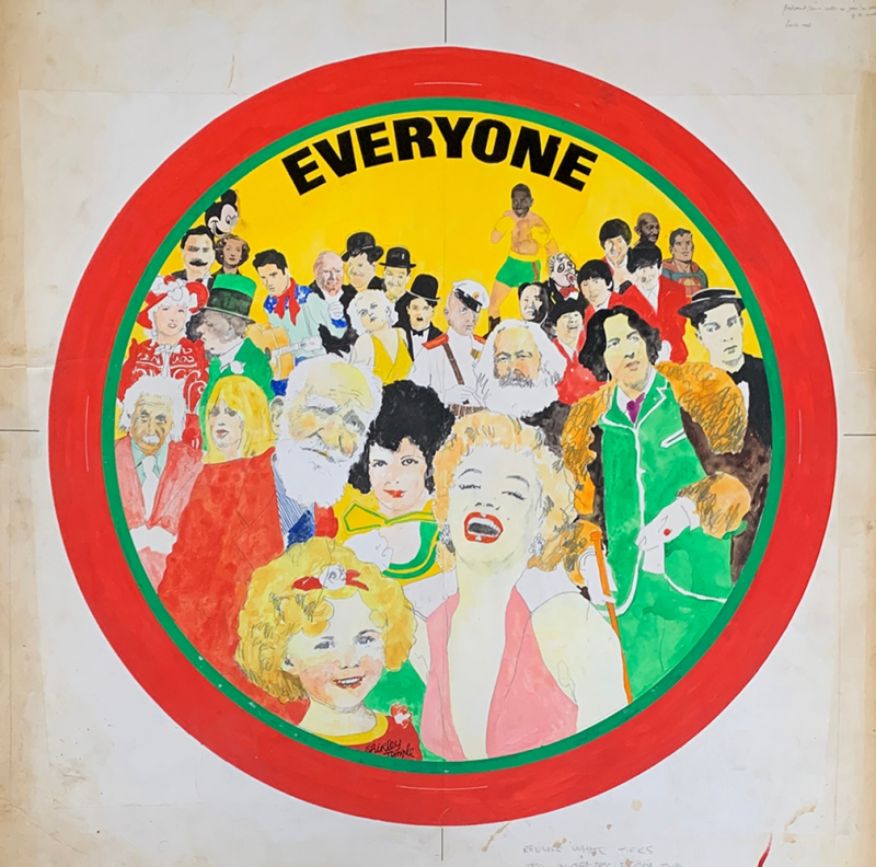 Original 1960’s artwork by Welsh artist Jeffrey Morgan. This circular design titled Everyone was for use on a tin box and/or tray. This is the original watercolour and pencil artwork with artist notes in the outer white area. It outer board measures and the circular artwork is 65cm diameter. The rectangular board measures 74cm (wide) x 88cm (high). The artwork includes (amongst others) images of Marilyn Monroe, Oscar Wilde, Einstein, Elvis, Laurel & Hardy, The Beatles and Mickey Mouse.